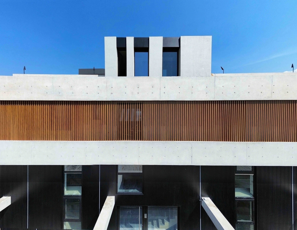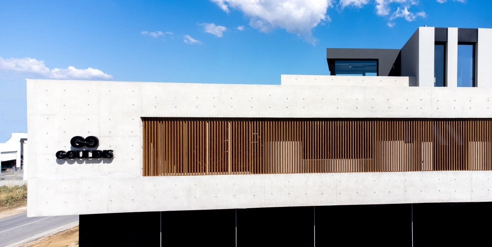 Η έδρα της εταιρίας μας, στην οδό 19ης Μαϊου στην Θέρμη. Το έργο έλαβε το "Χρυσό" βραβείο στην κατηγορία "Office Buldings" στα Exteriors Awards 2025 και στην κατηγορία "Architecture & Construction Office" στα Interiors Awards 2025.