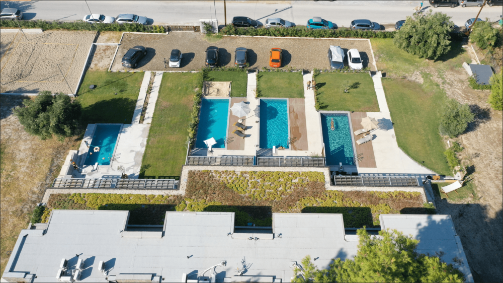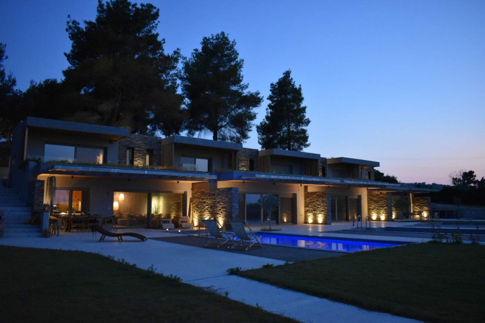 Five caved villas equiped with pools and green roofs in Chaniotis, Chalkidiki. Our project was presented with the "Gold" award at the Residential Development Awards 2020.