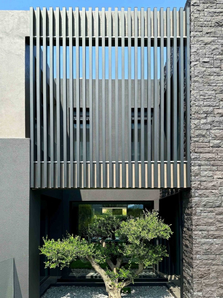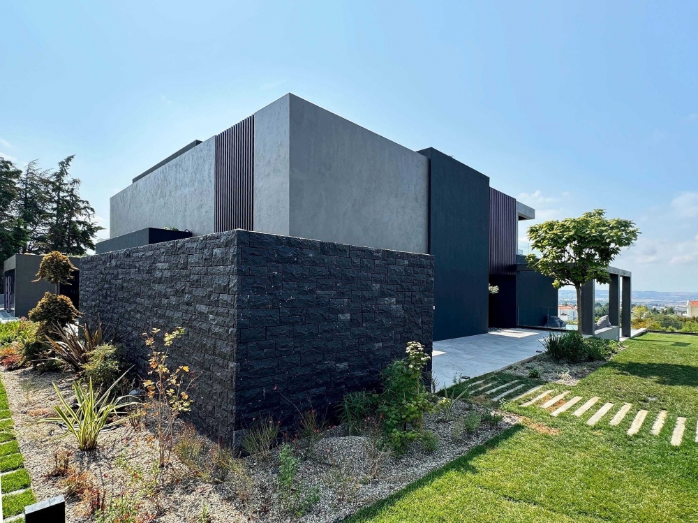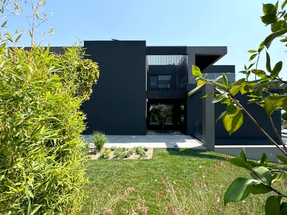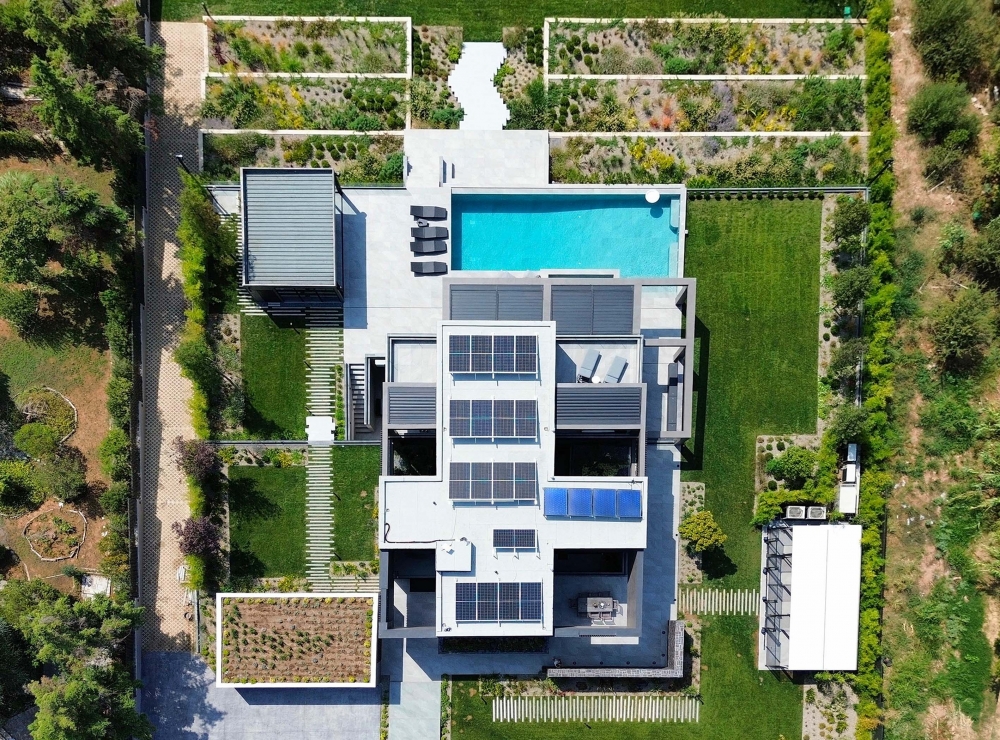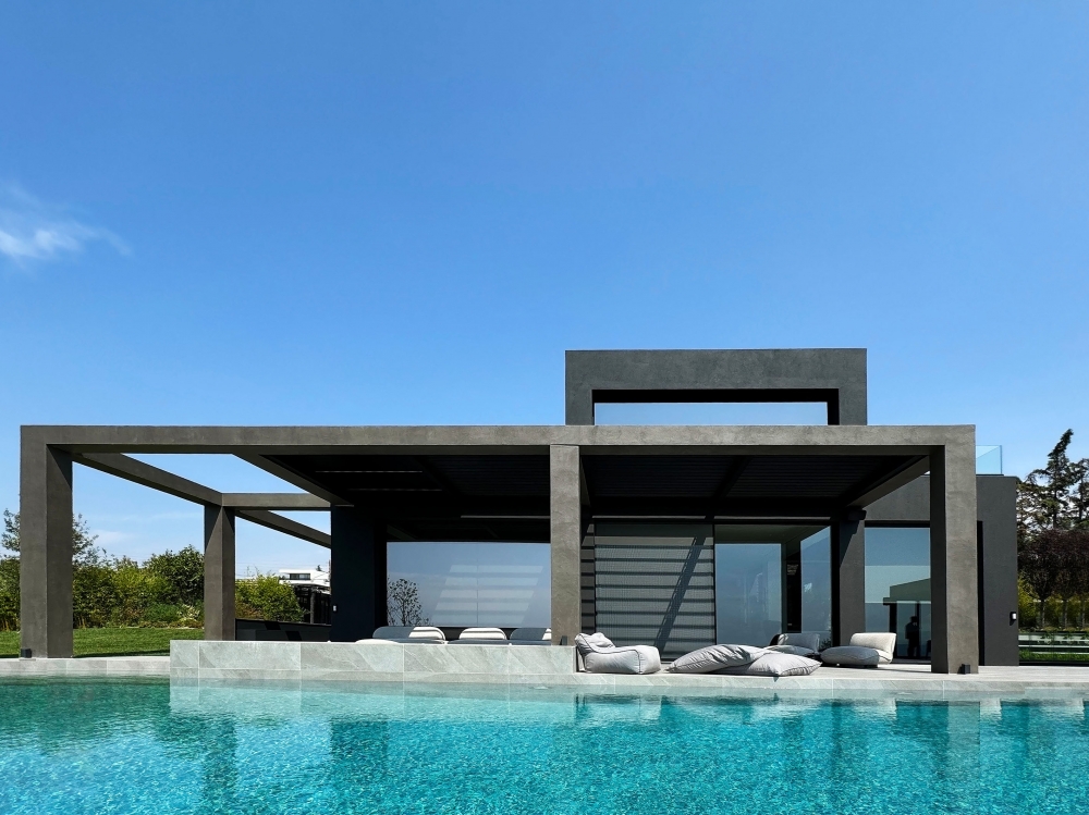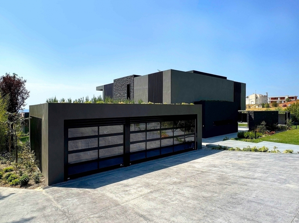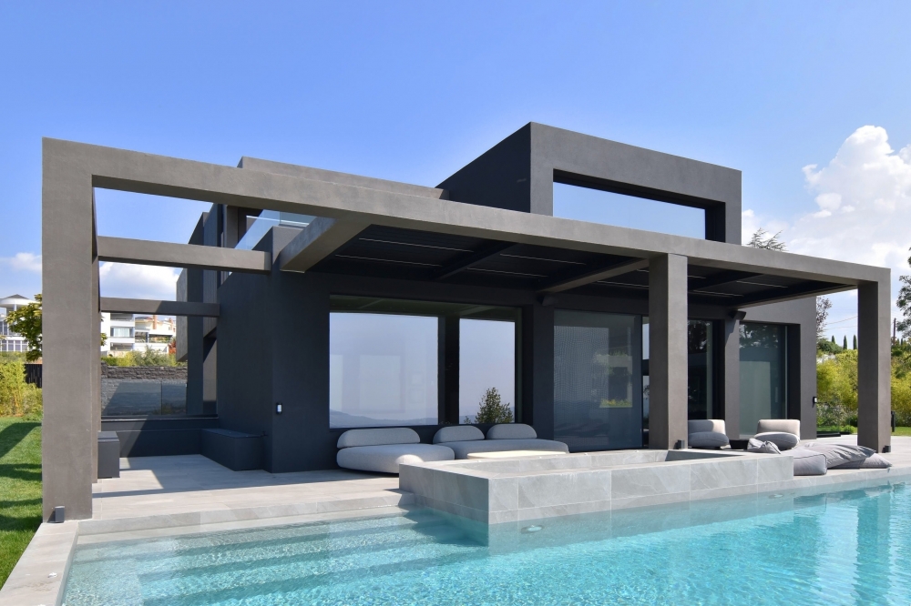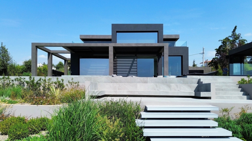 A bioclimatic luxury villa on a privately owned plot of land with a south-western orientation, offering unobstructed views of the sea horizon of Thermaikos, located on the outskirts of Panorama. It features a private infinity-edge swimming pool, a sheltered parking area, and ample greenery in the surrounding space. A modern construction of high energy class and aesthetic quality, with an extensive automation system that ensures functionality and comfort. Our project was presented with the "Silver" award in the "Best in Luxury Residential" category at the Exteriors Awards 2025.